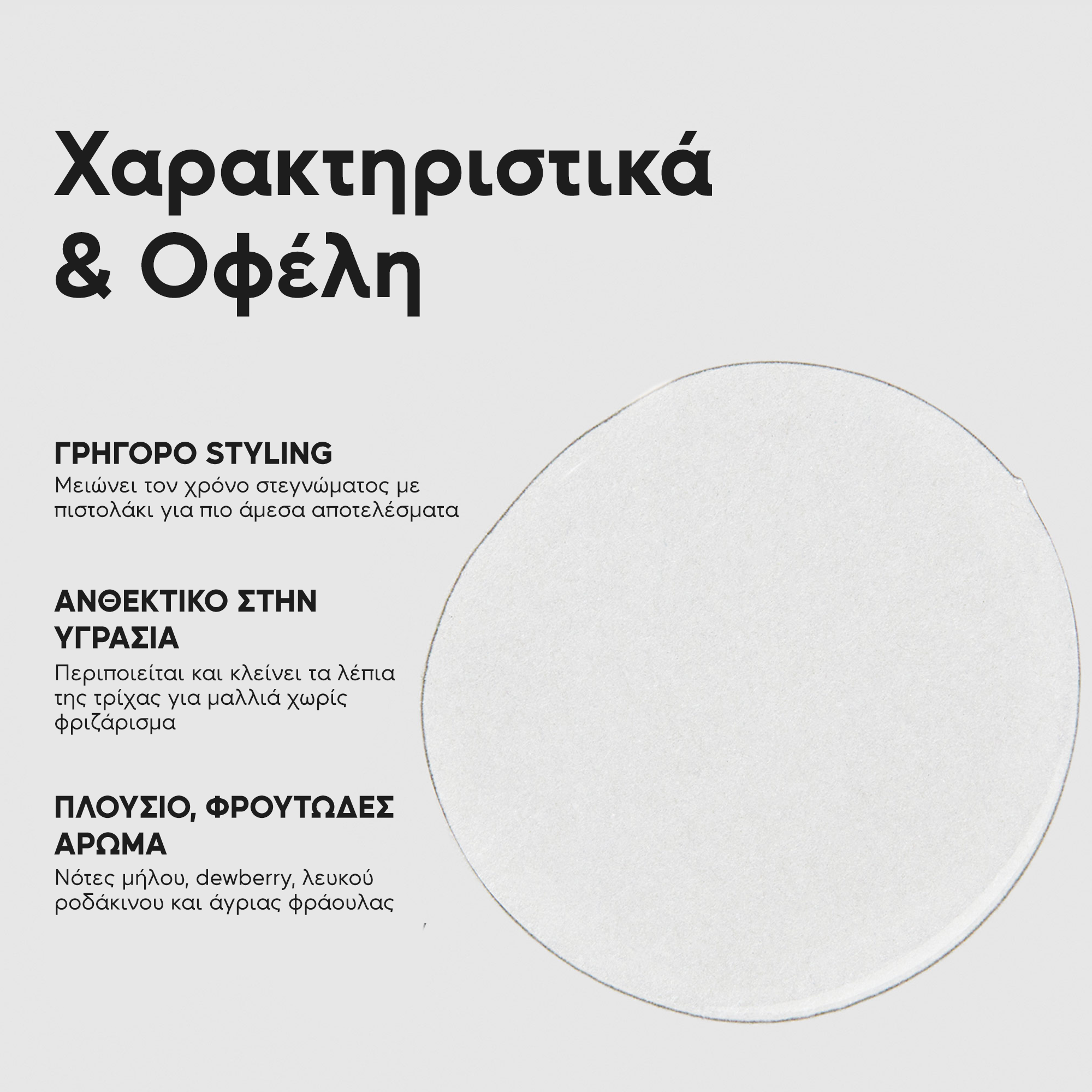 Η ελαφριά, εξελιγμένη σύνθεσή του λειαίνει την επιφάνεια της τρίχας και δημιουργεί ένα αόρατο προστατευτικό φιλμ, βοηθώντας στον έλεγχο του φριζαρίσματος και διατηρώντας τη φυσική κίνηση και τη λάμψη.