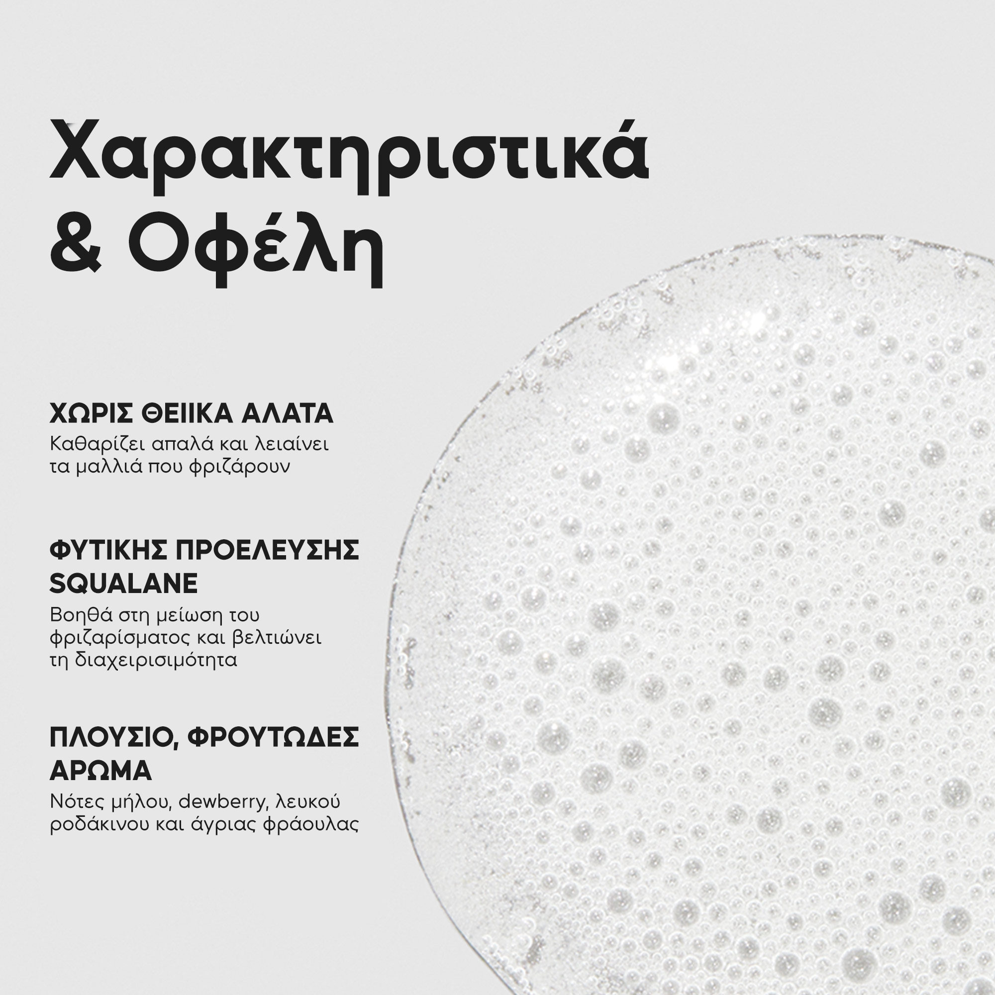 Η σύνθεσή του με φυτικής προέλευσης σκουαλάνιο συμβάλλει στη βελτίωση της διαχειρισιμότητας και στη μείωση του φριζαρίσματος, διευκολύνοντας το χτένισμα και το styling.